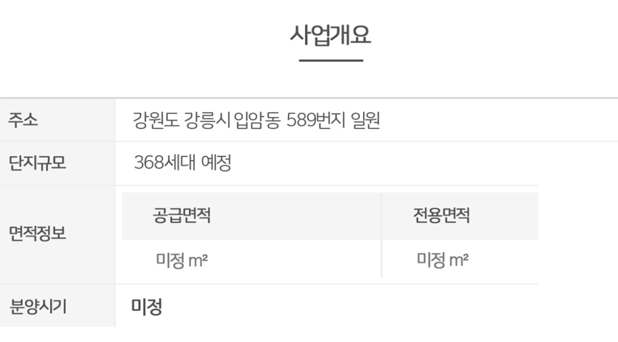 강릉시 자체가 최근 들어 도시 경쟁력을 높이기 위한 다수의 개발사업을 추진하고 있으며, 입암동은 그 중심에서 새로운 주거지로 떠오르고 있습니다. 대표적인 개발호재로는 KTX강릉역세권 개발, 강릉안인화력발전소 완공, 강릉자연에너지타운 조성 등이 있습니다. 이와 같은 도시 기반 확장은 향후 인구 유입과 함께 주거 수요를 확대시키며, 신규 단지의 자산 가치를 끌어올리는 요인으로 작용할 수 있습니다. 신규 분양 자체가 드문 입암동의 특성상 공급 희소성도 프리미엄 형성에 긍정적인 영향을 줄 것으로 기대됩니다.