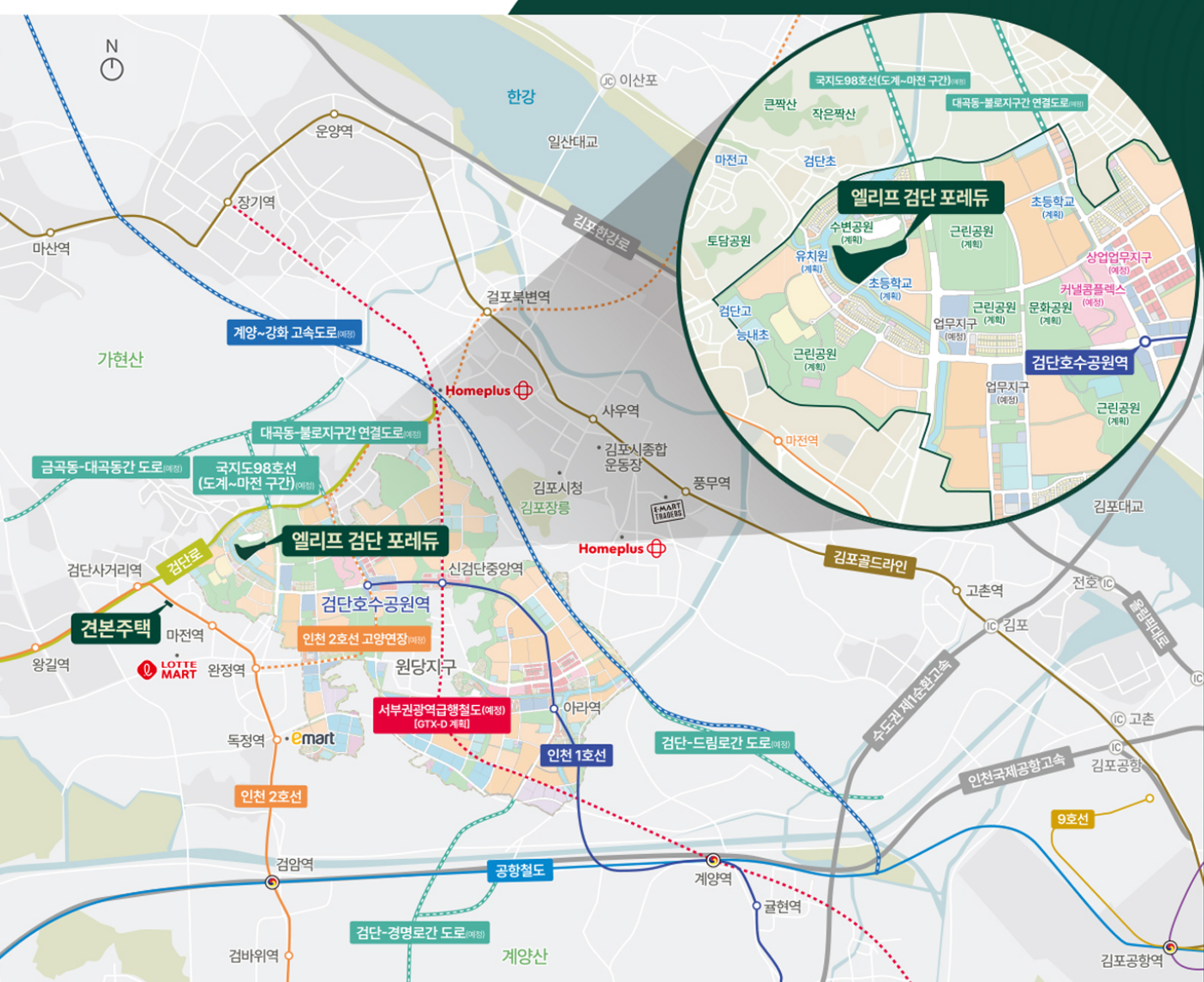 검단신도시 내 공급되는 대단지 중에서도 핵심 입지에 속하는 엘리프 검단 포레듀는 입주 시점 이후에도 추가적인 개발 여력이 남아 있습니다. 서울 5호선 연장, GTX-D 노선 개발, 신설 도로망 확충 등 교통 호재가 계속해서 이어지고 있어, 중장기적으로 주거지의 가치가 상승할 여지가 높습니다.