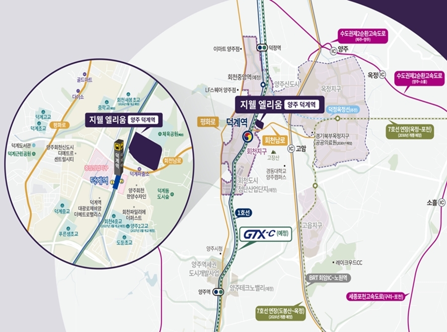 지웰 엘리움 양주 덕계역 단지의 가장 주목되는 개발호재는 7호선 연장과 GTX-C 노선입니다. 두 교통망 모두 서울 중심부까지의 접근 시간을 크게 단축시켜줄 수 있으며, 역세권 가치 상승에 긍정적인 영향을 미칠 것입니다. 회천지구와 옥정지구 개발이 속도를 내고 있으며, 덕계역 중심의 도시개발계획과 상업지역 확장도 예정되어 있어 생활권 확장과 인프라 확대가 동시에 이루어질 전망입니다. 수도권제2순환고속도로의 완공 및 연계 도로망 확충은 광역 접근성 측면에서 큰 변화를 가져올 수 있습니다. 이러한 변화들은 지웰 엘리움 양주 덕계역이 단기적인 실거주 만족도는 물론, 장기적인 투자 가치까지 확보할 수 있는 이유로 작용하고 있습니다.