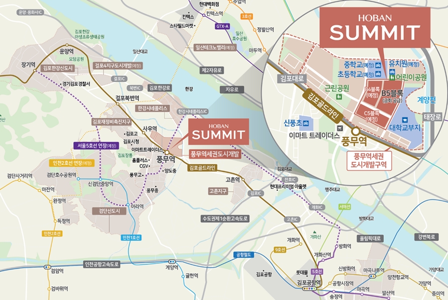 김포 풍무 호반써밋은 김포골드라인 풍무역을 도보로 이용할 수 있는 역세권 단지입니다. 약 5~10분이면 역에 도착할 수 있으며, 이를 통해 김포 구래, 김포공항, 서울 도심으로 환승 이동이 가능합니다. 특히 서울 지하철 5호선 연장 계획이 추진되고 있어 향후 풍무역 정차가 확정된다면 더블역세권 입지를 확보하게 됩니다. 차량 이동도 편리합니다. 김포대로, 유현로, 태장로, 사우중로를 이용하면 시내 전역으로 이동이 쉽고, 김포IC, 한강시네폴리스IC를 통해 수도권제1순환고속도로, 인천국제공항고속도로, 올림픽대로로 빠르게 연결됩니다. 서울 강서구와 인접해 직주근접성이 높고, 인천이나 일산, 부천 등 수도권 주요 도시에 접근하기 수월합니다.