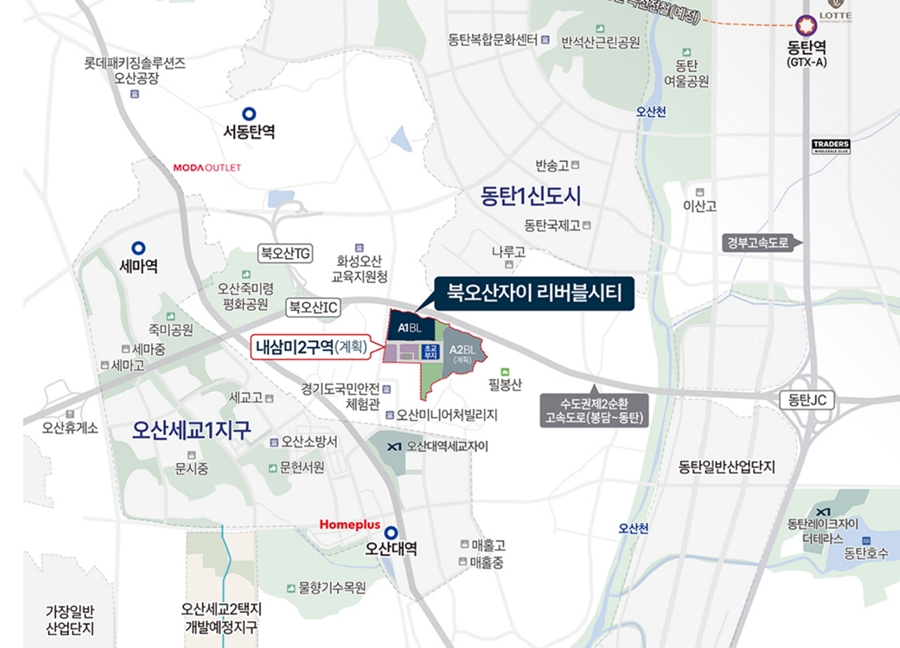 북오산자이 리버블시티 생활 인프라는 이미 완성 단계에 있습니다. 차량으로 약 5분 거리에 동탄신도시 중심권이 위치해 롯데백화점, 이마트 트레이더스, 한림대학교동탄성심병원, 학원가 등 주요 시설을 손쉽게 이용할 수 있습니다. 오산 도심권의 이마트, 롯데마트, CGV 오산중앙점 등도 가까워 두 지역의 상권을 모두 활용할 수 있는 입지입니다.