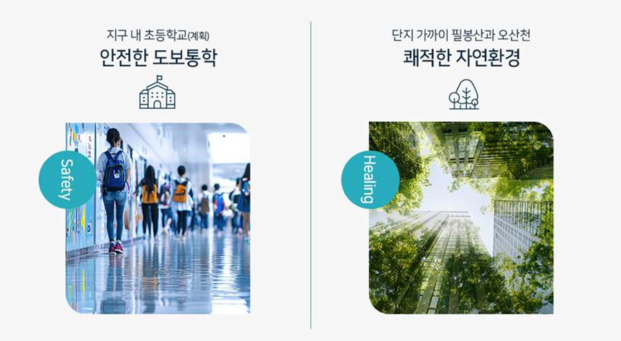 북오산자이 리버블시티 교육 환경 측면에서도 발전 여지가 충분합니다. 단지 앞에는 초등학교 신설이 추진 중이며, 인근 중학교 설립도 확정되었습니다. 어린이집도 단지 내에 함께 들어설 예정으로, 자녀의 통학과 돌봄이 모두 단지 안에서 해결되는 구조입니다. 또한 필봉산 산책로, 내삼미2구역 내 대규모 공원 조성 계획 등 자연 친화적인 요소가 인접해 있어, 쾌적한 주거 환경을 누릴 수 있습니다. 물향기수목원, 동탄호수공원 등 주요 녹지 시설도 접근이 용이해 여가 활용 측면에서도 장점이 있습니다.