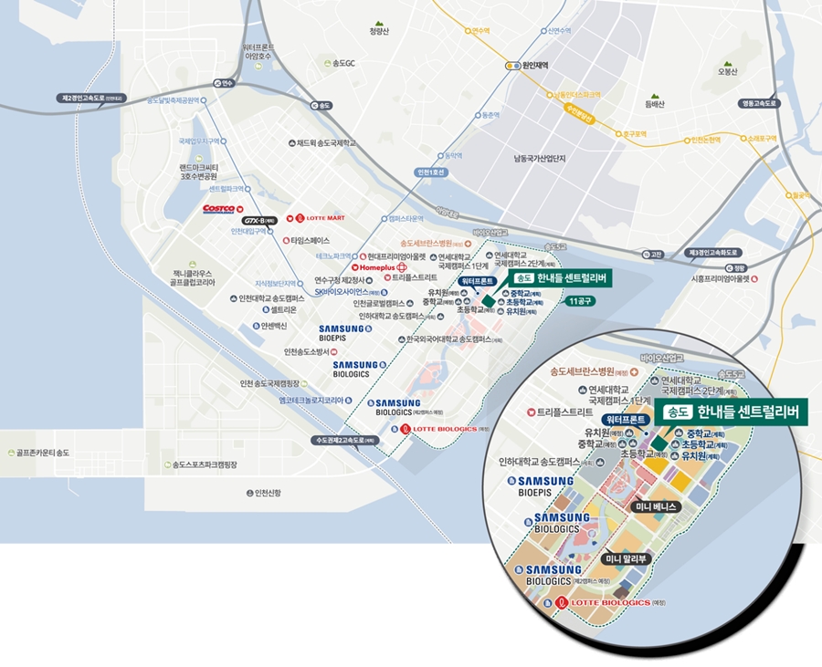 송도는 도시 전반이 단계적으로 확장되는 방식이 아니라, 구역별 자족 기능을 갖춘 채로 확장되는 구조입니다. 11공구 내 상업, 업무, 교육 기능은 이미 확정된 도시계획에 포함되어 있어, 입주 시점에 주변 생활 기반이 어느 정도 갖춰질 가능성이 큽니다. 특히 송도에서 중요한 점은 업무지구와 주거지 간 거리뿐 아니라, 녹지 비율과 수변 접근성이 함께 확보된다는 점인데 한내들 수변공원과 연결되는 보행축이 단지 인근에 형성될 계획이라는 점은 일상적인 산책, 이동 동선에서 체감도가 큽니다.