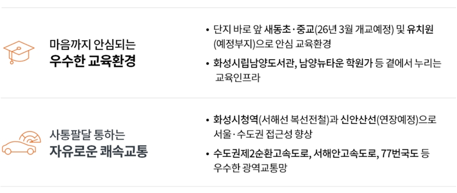 남양뉴타운의 교육 기반도 점차 갖춰지는 단계에 있습니다. 단지 인접지에는 새동초와 새동중이 개교 예정으로 준비되고 있으며, 유치원 부지도 함께 계획되어 있습니다. 이는 초등부터 중등까지 도보 중심의 통학 여건 형성 가능성을 의미합니다. 주변 생활권에는 시립도서관과 학습 관련 기반도 일정 수준 마련되어 있어 학령기 자녀를 둔 가정에서 안정적인 생활 환경을 기대할 수 있습니다. 뉴타운 내 중, 고등학교 신설 계획도 진행 중이므로 향후 교육시설이 한 생활권 내에 완결되는 구조가 형성될 가능성이 높습니다.